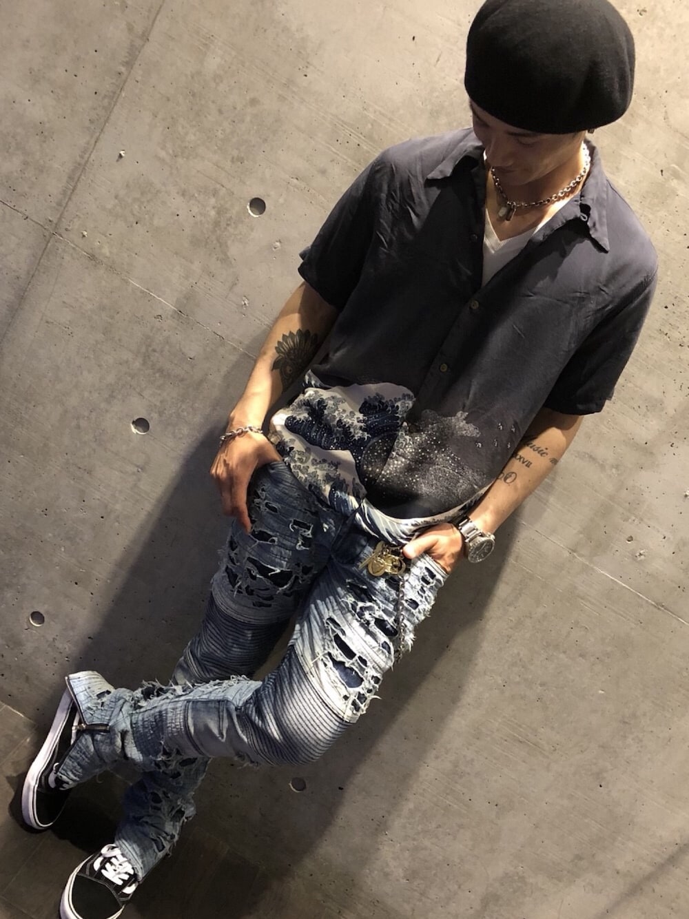 葛飾北斎の作品風のアロハシャツに出会い一目惚れ! 古着なので安くて購入しました😊 和風な感じが少し出ていてお気に入りのコーデです!✨
