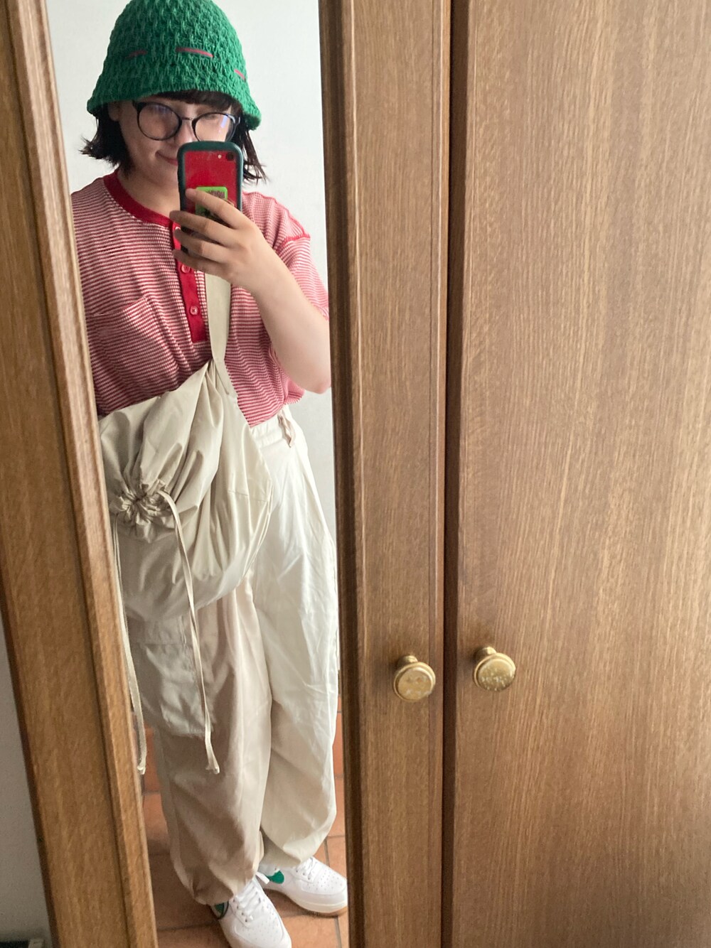 上半身は赤と緑でクリスマスカラーですが素材が夏だからいっかということで下は白くまとめてみました✌️