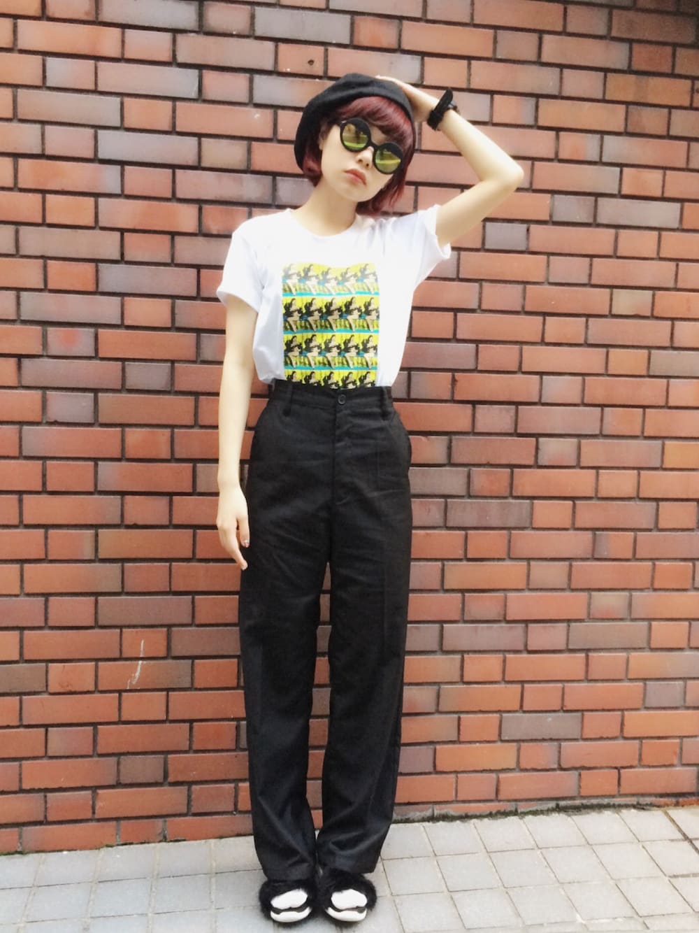 o.c crew のSALEで 買ったTシャツが とってもしっくりきて さらっと着こなしたかったので シンプルに黒のスラックスパンツで。