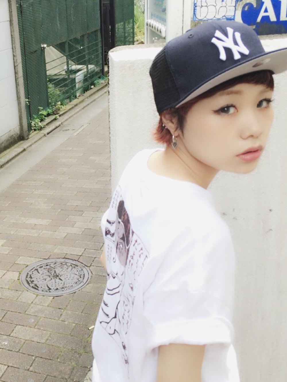 ホワイト系のTシャツ/カットソー、ブルー系のキャップを着用したレディースの夏コーディネートの1枚目の写真