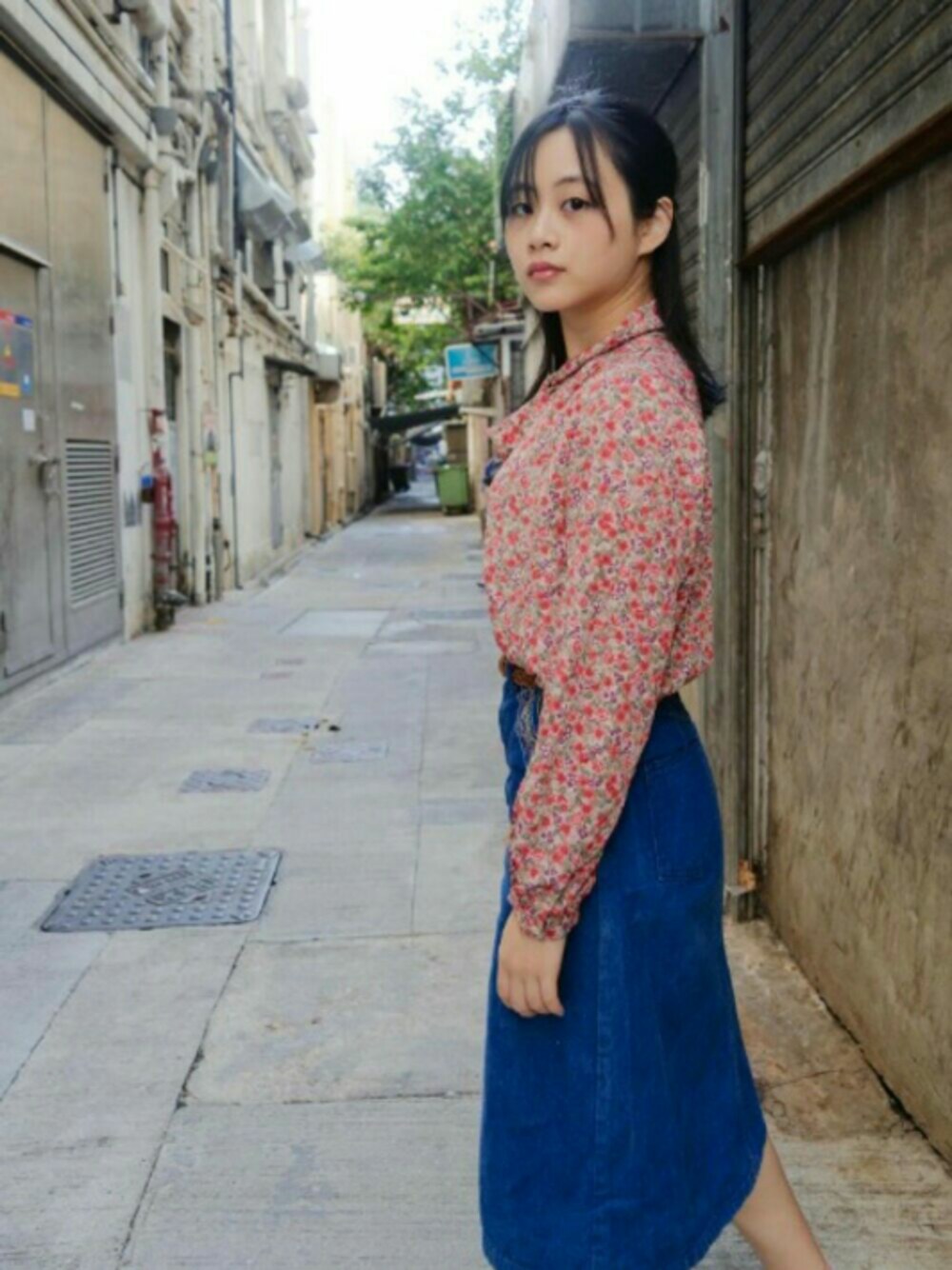 Colourful shirt with denim skirt