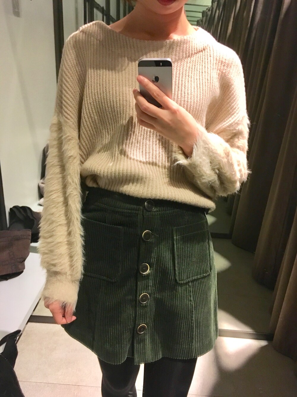 ZARAでTRAFALUCのコーデュロイスカート購入♪ 色物欲しかったからかわいいのあってラッキー! 大きめのサイズ感だったのでXSで大丈夫だった* ニットは去年買ったやつ。