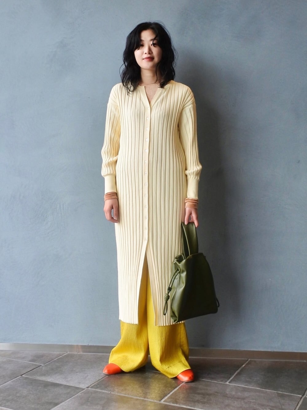 めずらしいイエローのワントーン オレンジのシューズを差し色に🍊