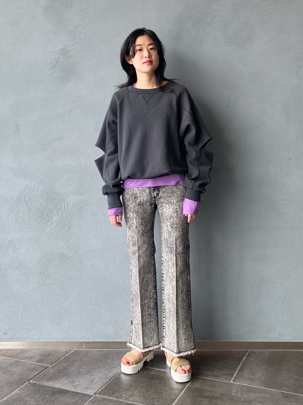 Instagram → @_______fuku115 今ちょうどいいスウェット🌸 スリット入りなので、 BaserangeのカラーロンTを ちらっとみせてます💜