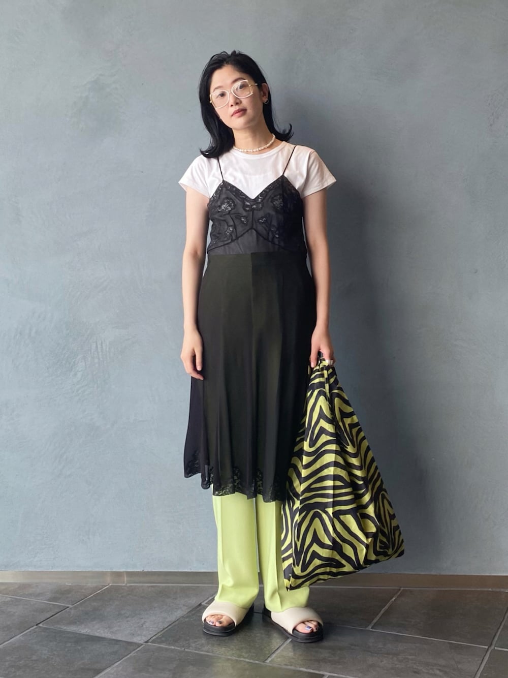 Instagram → @_______fuku115 vintageのランジェリーを使ったレイヤードスタイルです💚 クセなメガネがポイント🥸✔︎
