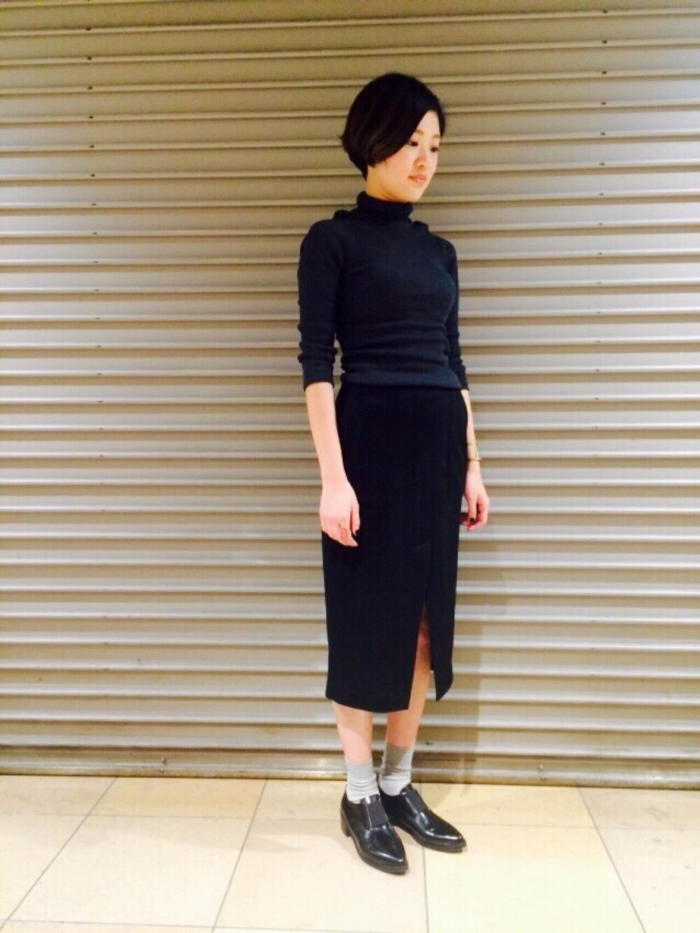 タイトな女性らしいシルエットに、 足もとは高さのあるローファーで格好良く。 グレー×ブラックのワントーンで、 よりモードな印象に。