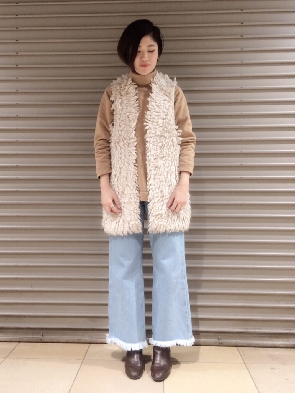 ループベストをアクセントに。 キャメル×ライトブルーの色合わせが最近のお気に入りです。