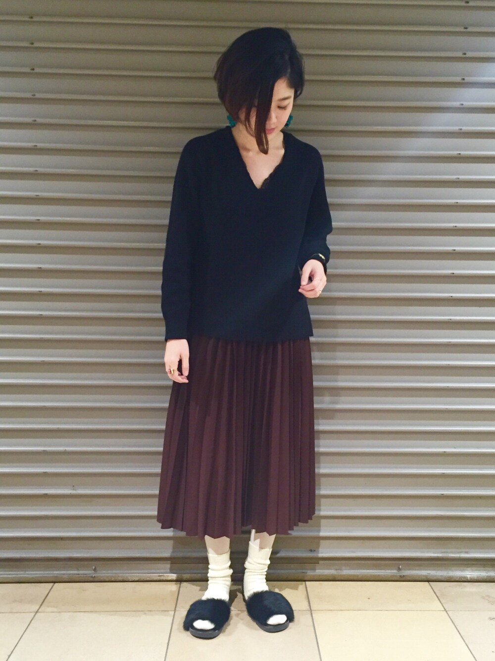 Vネックからレースのキャミがチラリ。 女性の特権。