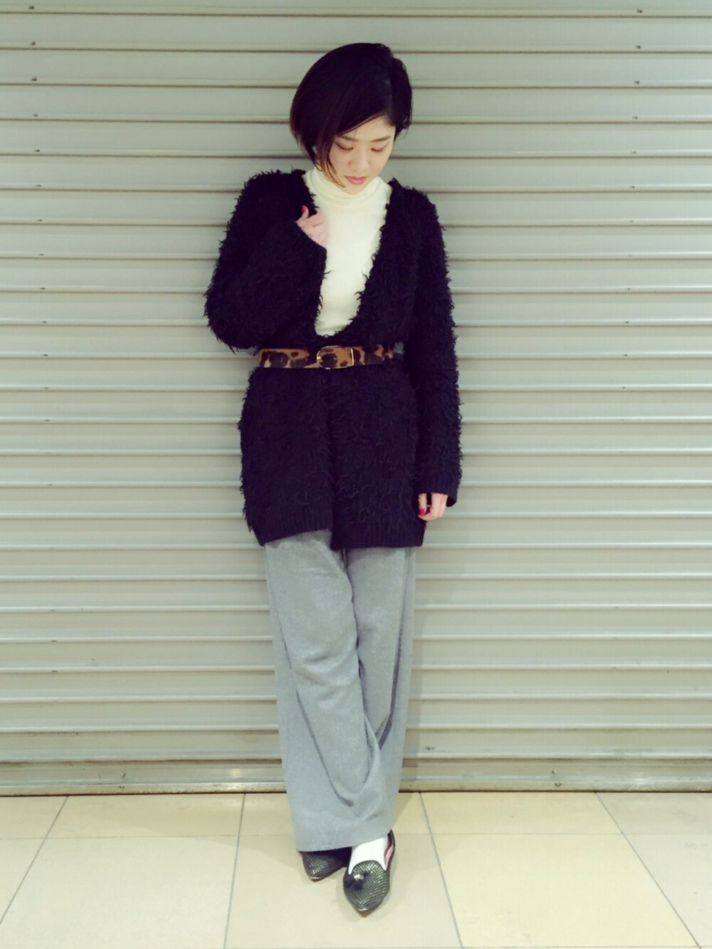 今日はウエストマークしたい気分でした。 モコモコカーディガン×ワイドパンツ、ロングバランスにウエストマークでコーディネートに締まりを与えました。