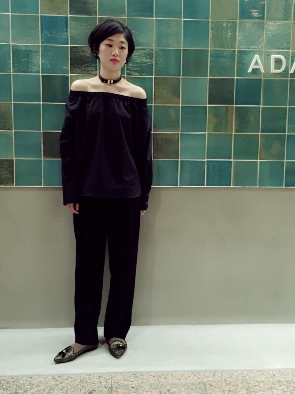 初めてのオフショルダー オールブラック+チョーカーで少しハードな印象に。 袖が長いので甘すぎず、モードに着れますよ📍