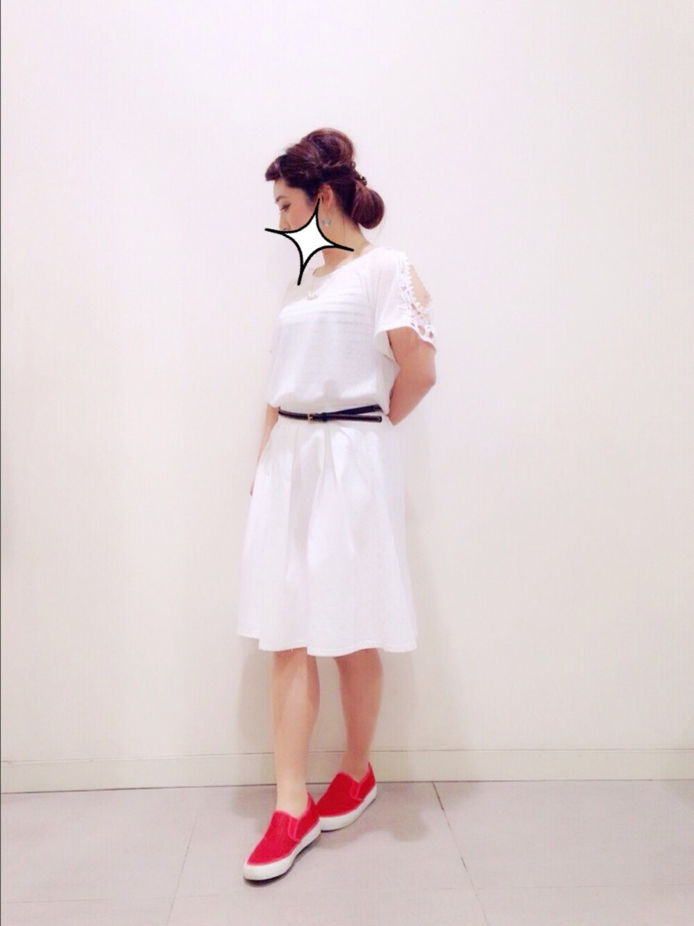 ホワイトコーデ☆ 夏はホワイト多め。 爽やかでいいかなーって思っちゃう。 このトップス、ボトムス選ばないから優秀♡使いやすい♪ デニムスカートのホワイト、衝動で買ってみたけどかなり使える♪ よかったー♡ 赤のスリッポンは、 超楽ちんで可愛くてお気に入り♡ メッシュだから涼しい♪