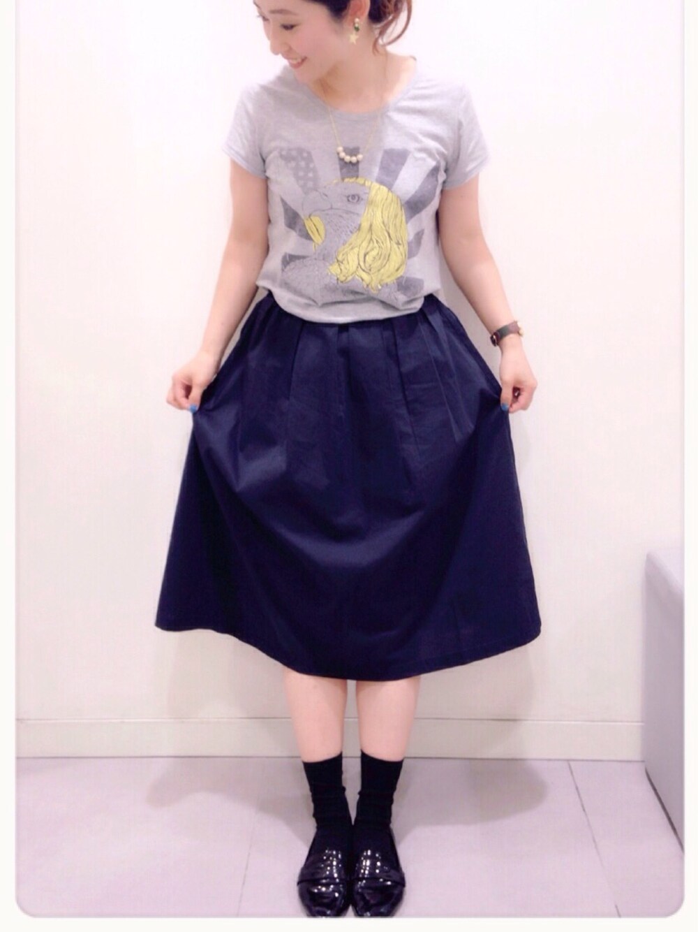 新商品のスカートを早速着用♡ はき心地よいし使いやすいな♡ しばらくヘビロテごめんなさい笑。 偏ったコーディネートばかり。 違うのに挑戦したい♡ 相変わらずお気に入りのTシャツを合わせて♪