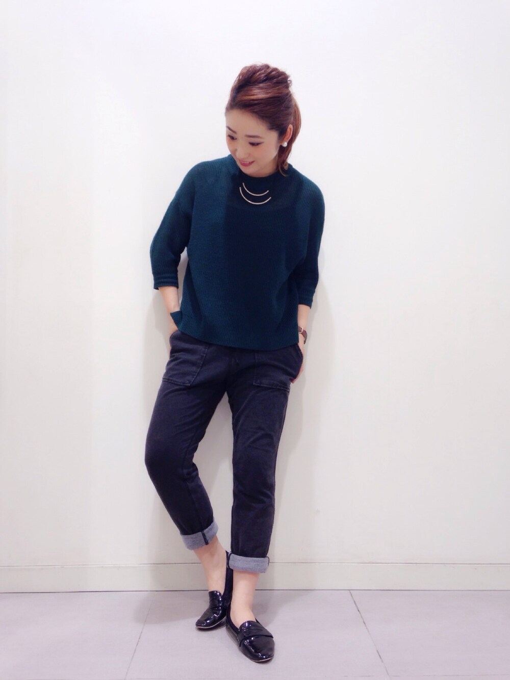 スウェットらくちーん♪ ダークめなぐりーんのニットを合わせて