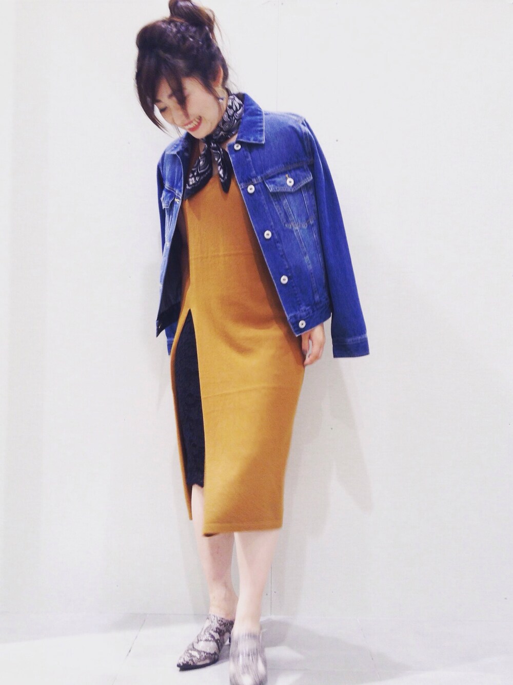 オーバーサイズデニムジャケットがお気に入り🙆 テラコッタのニットスリットベストをレーススカートにあわせて。