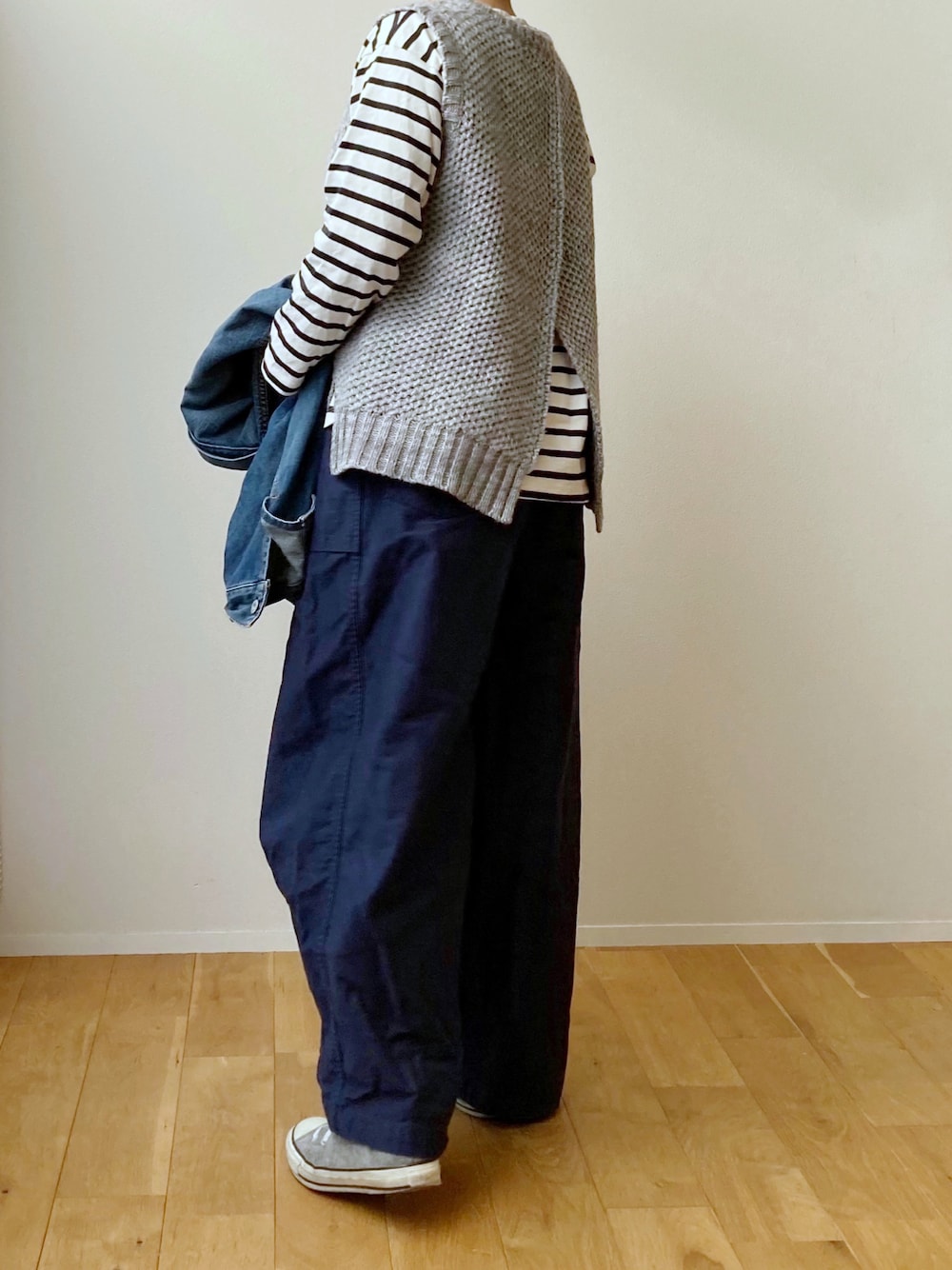 バックスタイルが好きな ニットベストコーデ。 needlesのヒザデルパンツ。 その名の通り、 ヒザの出具合!?が好きです。