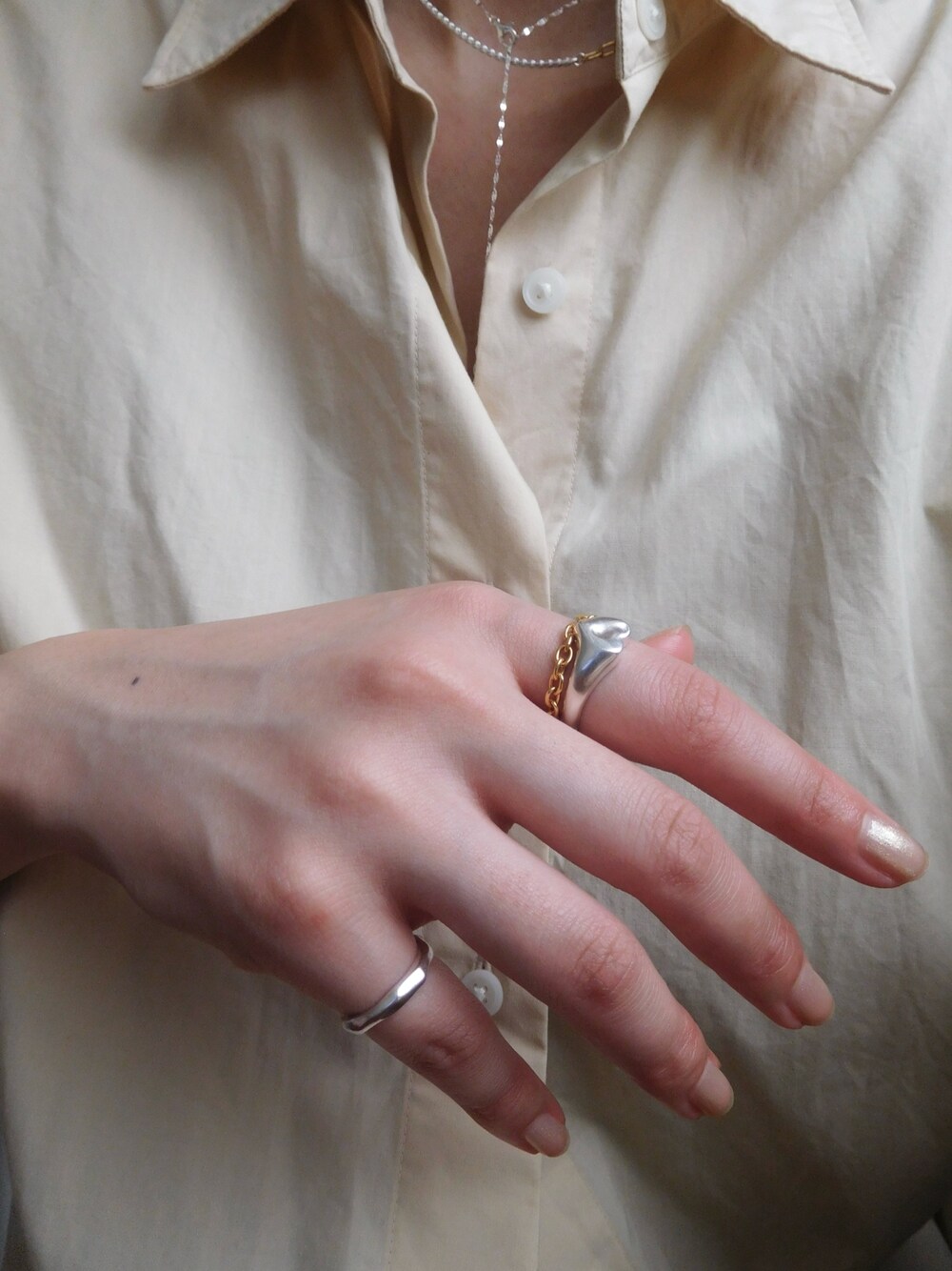 ハートシグネットリングに、チェーンリングを重ねづけ✨ チゼルリングは、トップ面を後ろに回しシンプルにも着用していただけます。