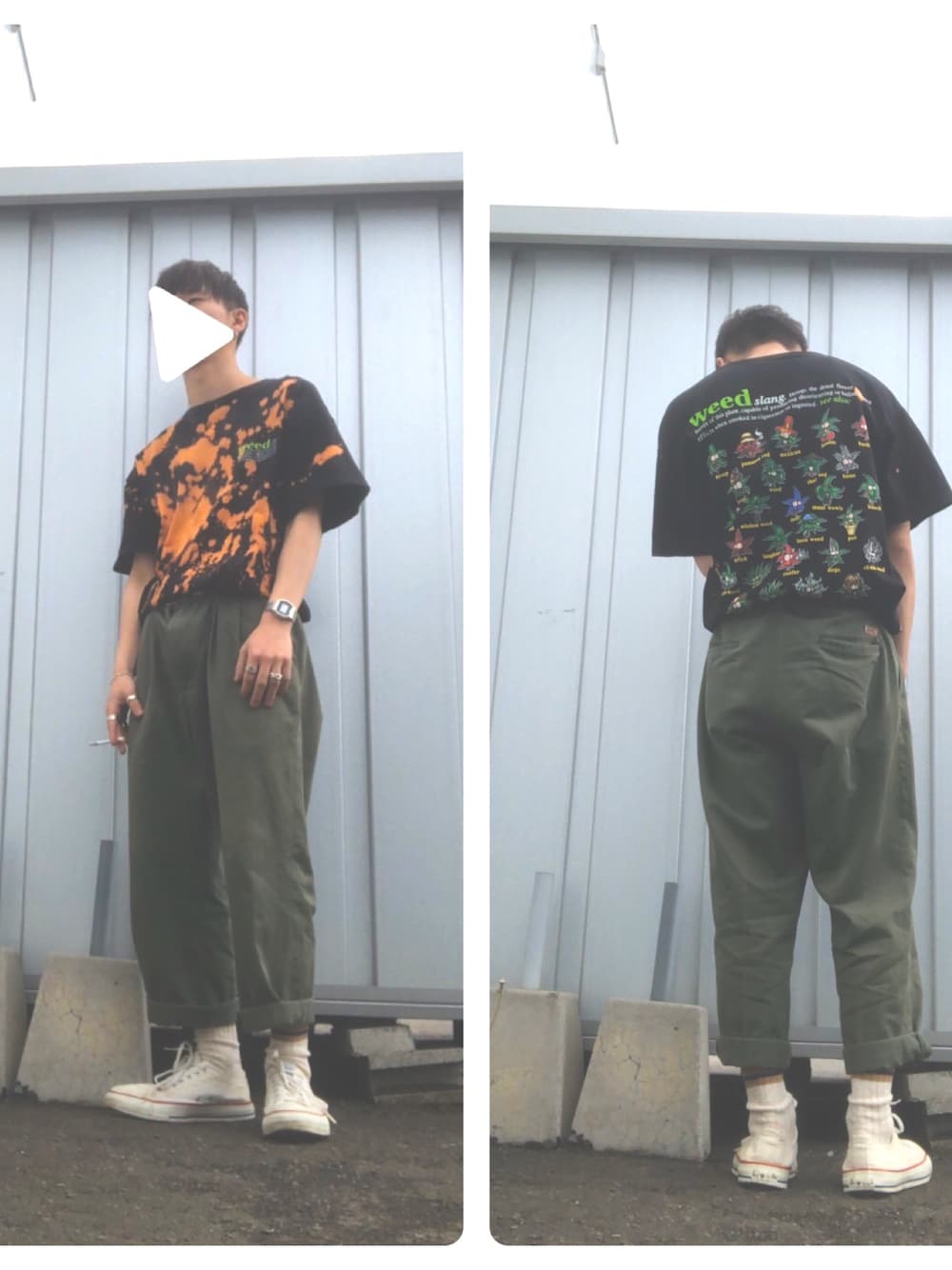 こんにちわ…💭 今日も休憩中に一枚📷 今日の気温めちゃめちゃちょうどよくてこの格好でも問題なしですわっ。(夜は寒いのでコーチジャケット着てきてます) このイカれてるTシャツ昨日ブリーチ加工して早速着てみたらいい感じに味出てます。いいものができました!近々かデニムにペイントもやりたいなぁ… 皆さん緊急事態宣言が解けて、いかがお過ごしですかね?? p.s タバコは吸ってもweedは吸いません。