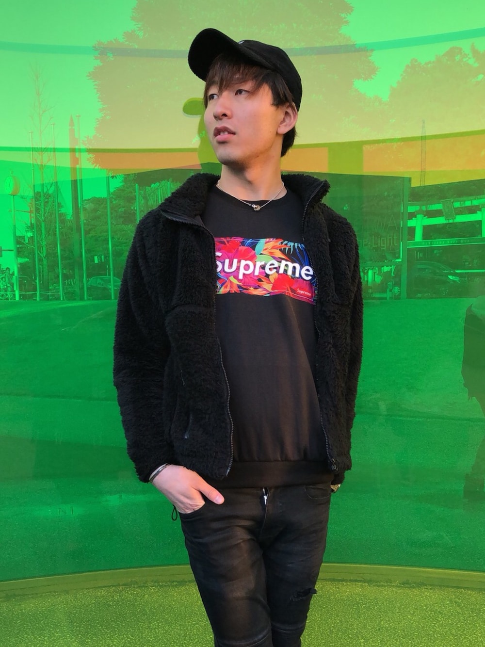 同じ黒色を素材を変えることによって重くなりすぎないようにコーディネートしました! またワンポイントのアクセントとしてトップスに色のあるものを着用しました!