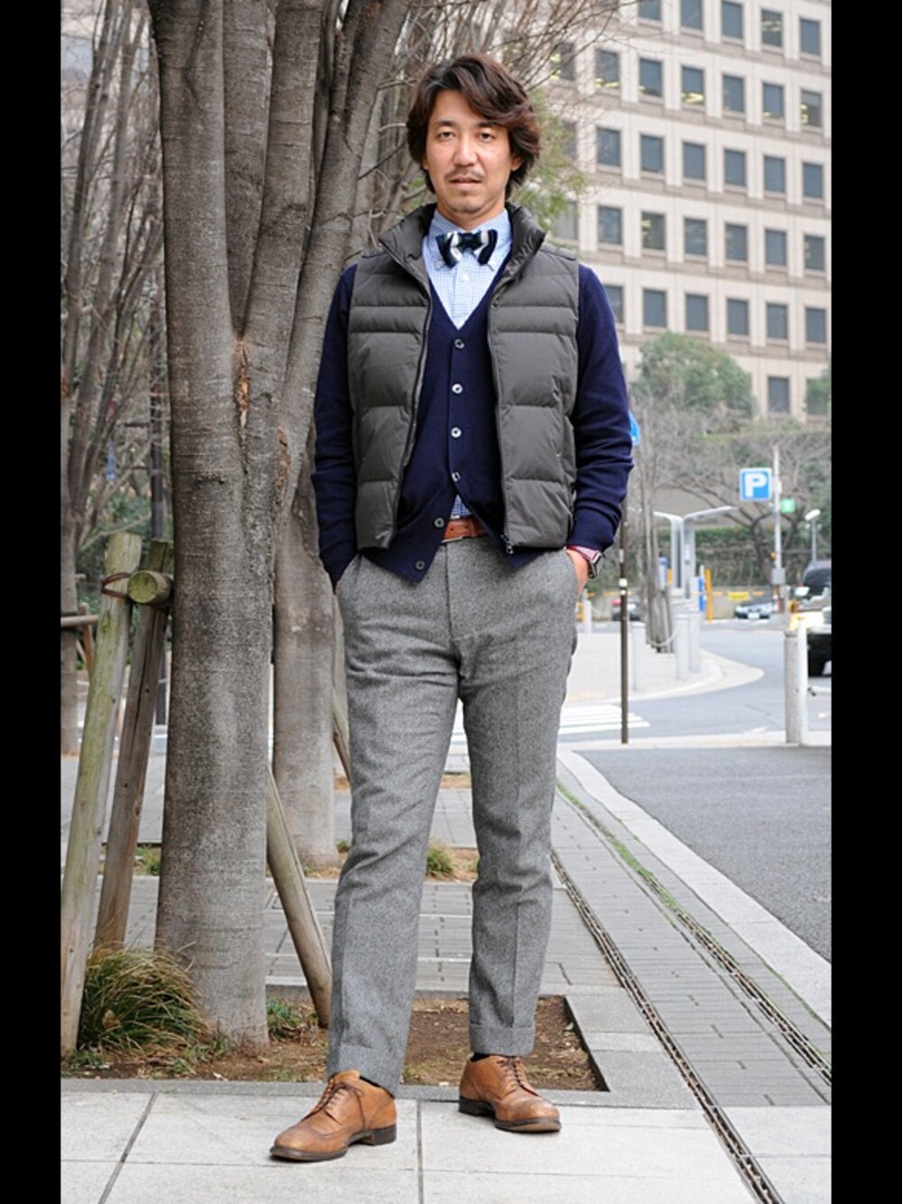 ギンガムチェックのボタンダウンシャツにハイゲージの紺のウールカーディガン。 ノータイで第一ボタンをあけて着用するのは少しさびしいと思い、ネイビー×グリーンのストライプ柄蝶ネクタイを合わせてみました。 ボトムスはライトグレーのウールパンツに茶色のウイングチップシューズ。 このコーディネートにダウンベストを持ってくるだけで、ベーシックな組み合わせがややスポーティーな雰囲気に早変わり。 ダウンベストは手に持ちやすいので、寒暖の差が激しい3月は結構使えるアイテムだと思います。