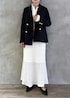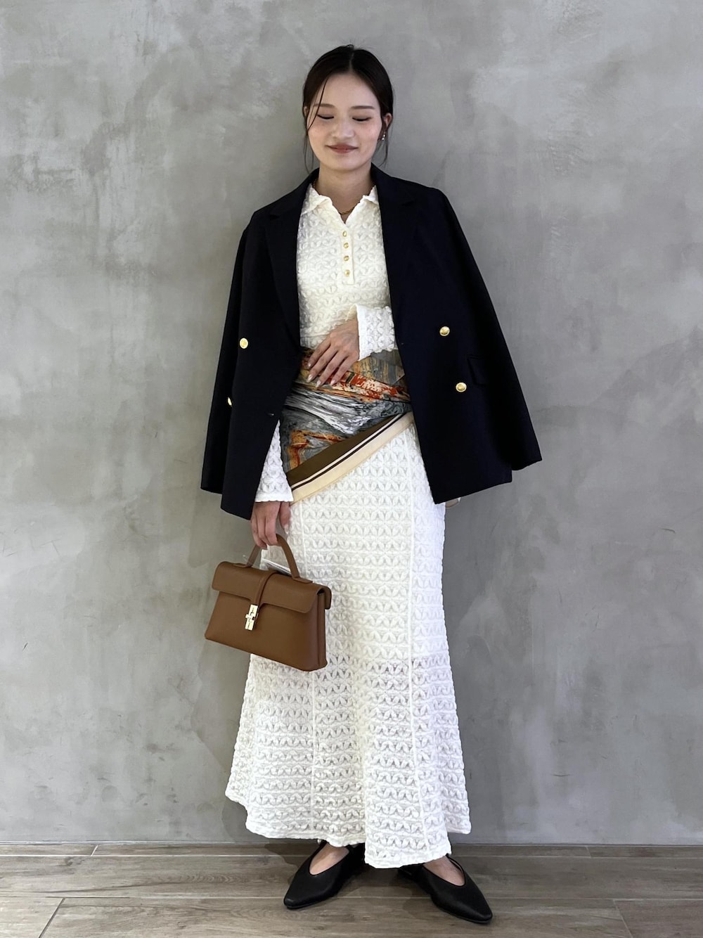 ジャケット×白ワンピースは春の定番。 定番だからこそ、いつもと違う雰囲気で、 スカーフを腰巻きしてトレンド感をプラス⭐︎ 足元は敢えてフラットシューズで抜け感を出しました。