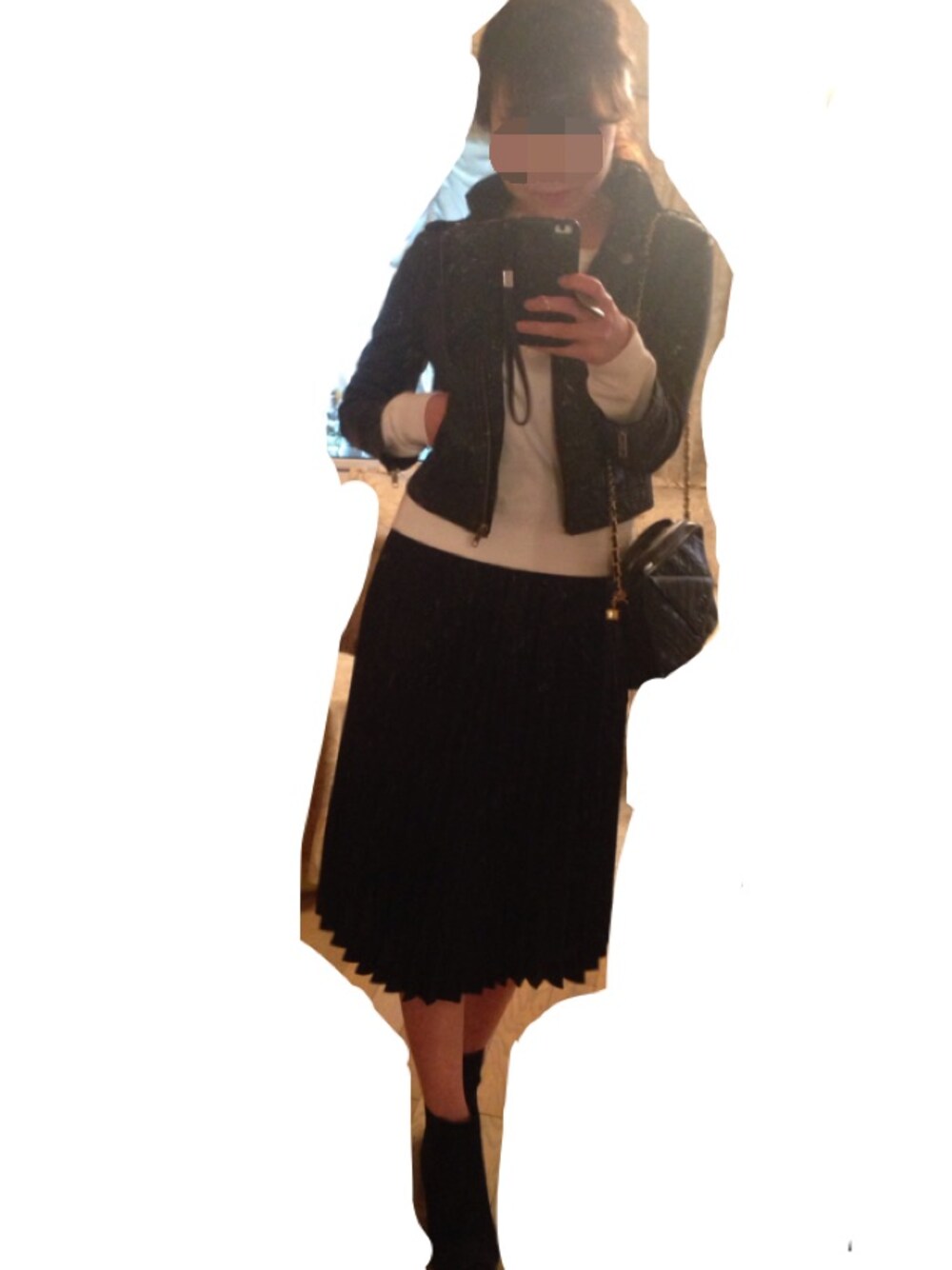 丈の短いライダース×黒のロングプリーツスカート 背の低い私でもバランス取りやすい組み合わせ! 中にはUNIQLOの白のスエットでモノトーンコーデ♡