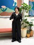 一枚で決まるジャンプスーツ サイズはフリーサイズです 147cmで厚底履いてスレスレな感じでした 胸元のフリルがインパクトがあり、シンプルですが一枚でおしゃれに着ていただけます
