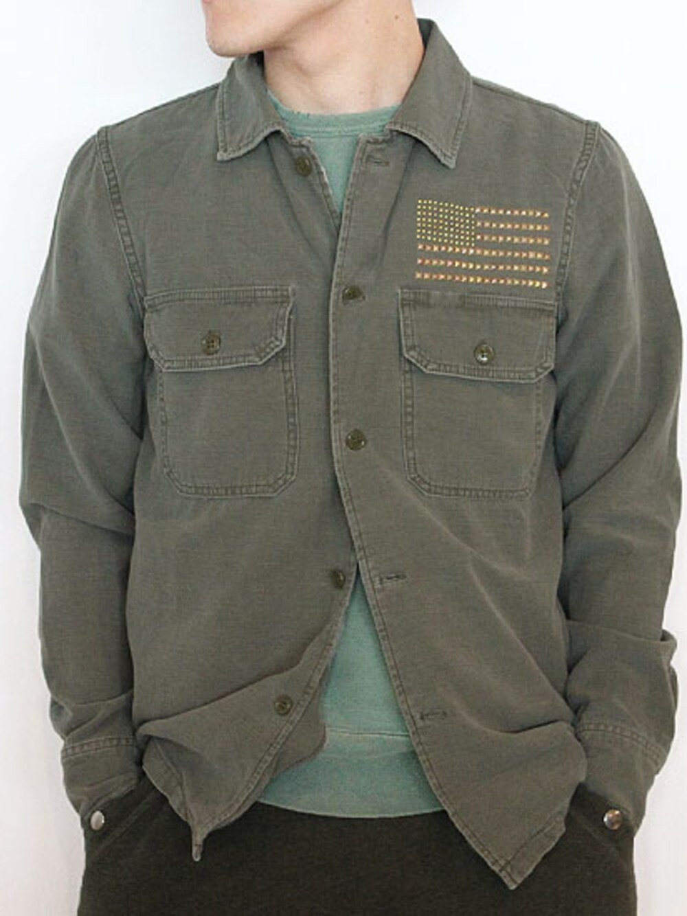 REMI RELIEF(レミレリーフ)から、毎度人気のミリタリーシャツより新作が入荷いたしました! 今回は胸ポケット上にアメリカ国旗をモチーフとしたスタッズワークがデザインされ、よりミリタリーな雰囲気! おなじみ独特のユーズド加工感はもちろん、シンプルながらも味わい深いシャツジャケットに! 一枚で着こなしたり、ジャケットのように羽織ったりと二つの着こなしを併せ持ち、シーズンレスで着回しの幅がかなり利く一着となっています! ブランド:REMI RELIEF(レミレリーフ) ミリタリーシャツ(アメリカ国旗) 販売価格:28,944円(税2,144円)