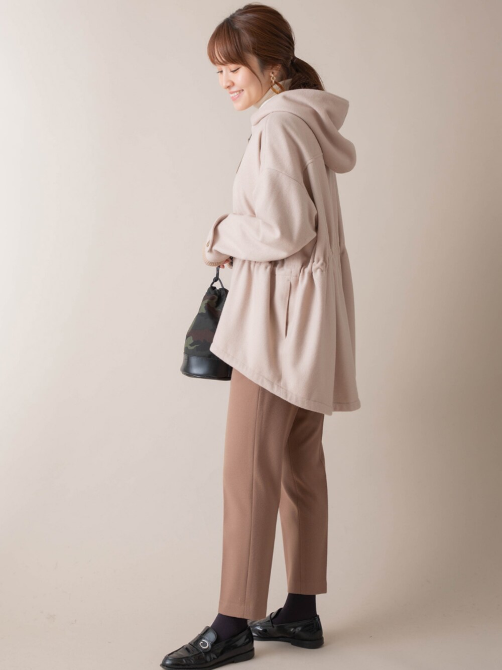 フードを外してノーカラーコートとしても✨ ゆったりしたシルエットにウエストギャザー、後ろ丈の長いバックテールシルエットがポイント✨