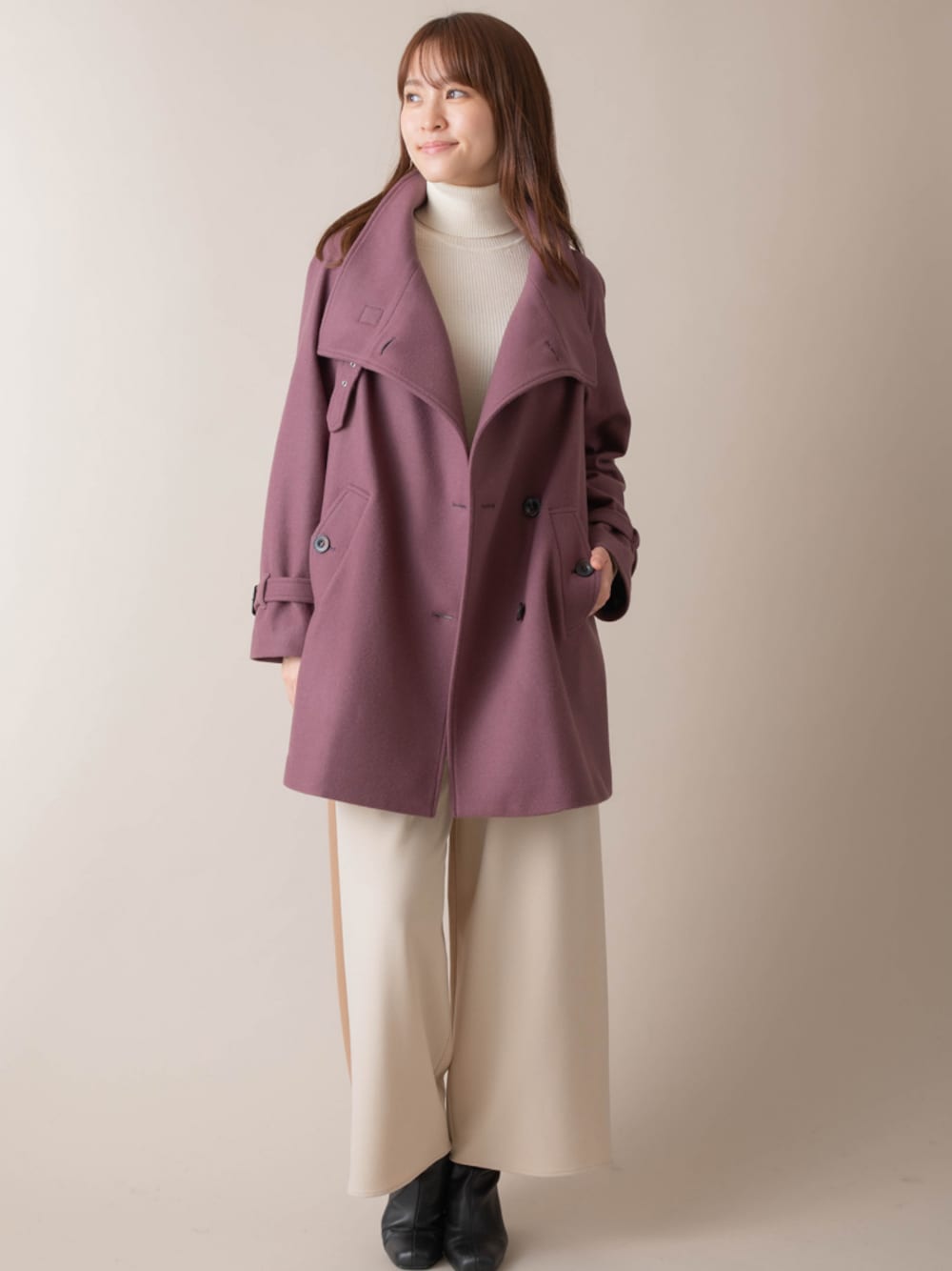 カジュアルにもキレイめにもコーディネートの幅の広いハイカラーコート✨ ラグラン袖からのゆったりめのシルエットと高めの衿デザインがポイント✨
