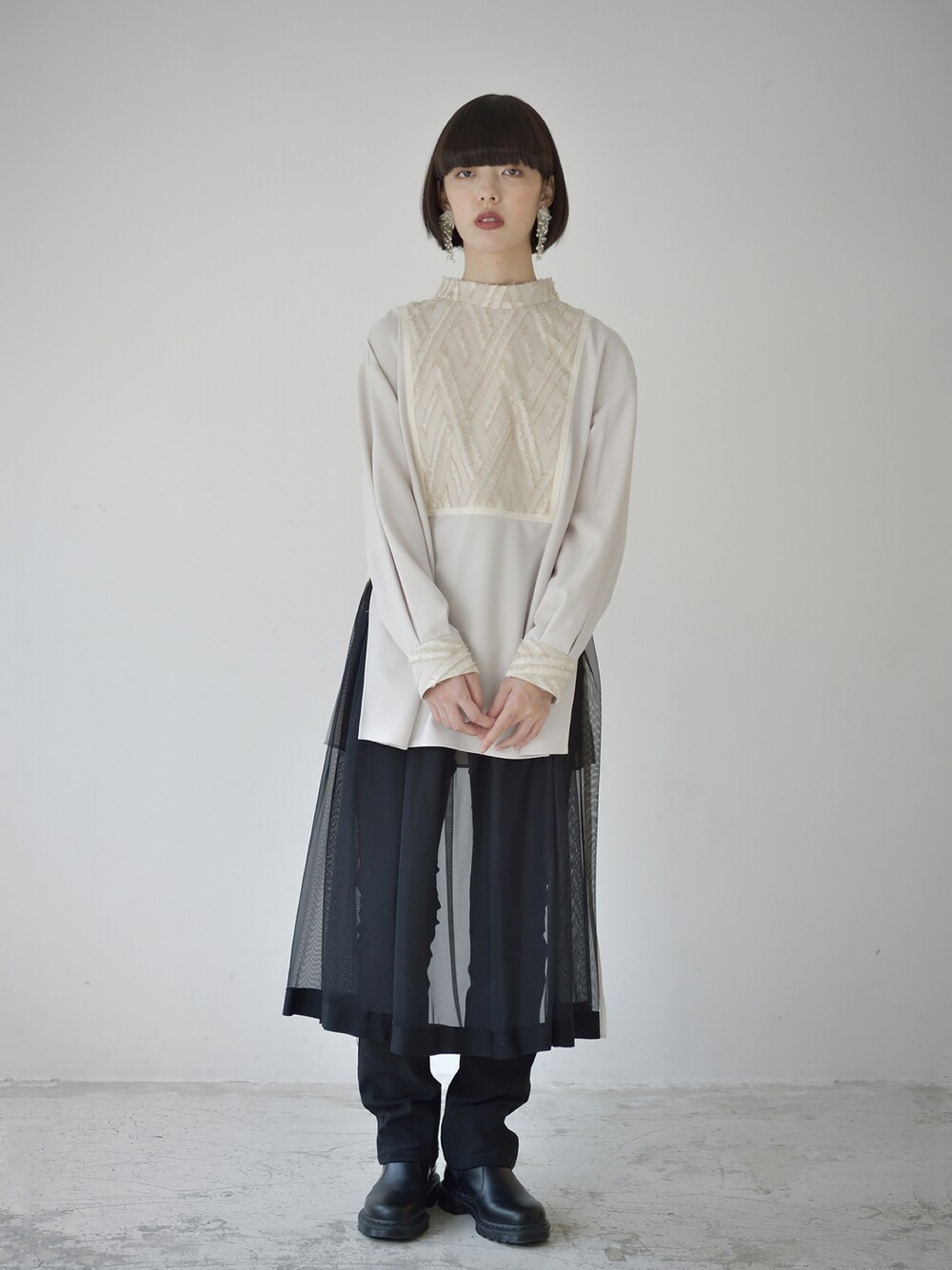 胸元のジャガード織り生地が可愛い ハイネックブラウス✨ スキニーパンツにチュールスカートを 合わせてレイヤードコーデ✨ instagram ▶︎ melton_sric