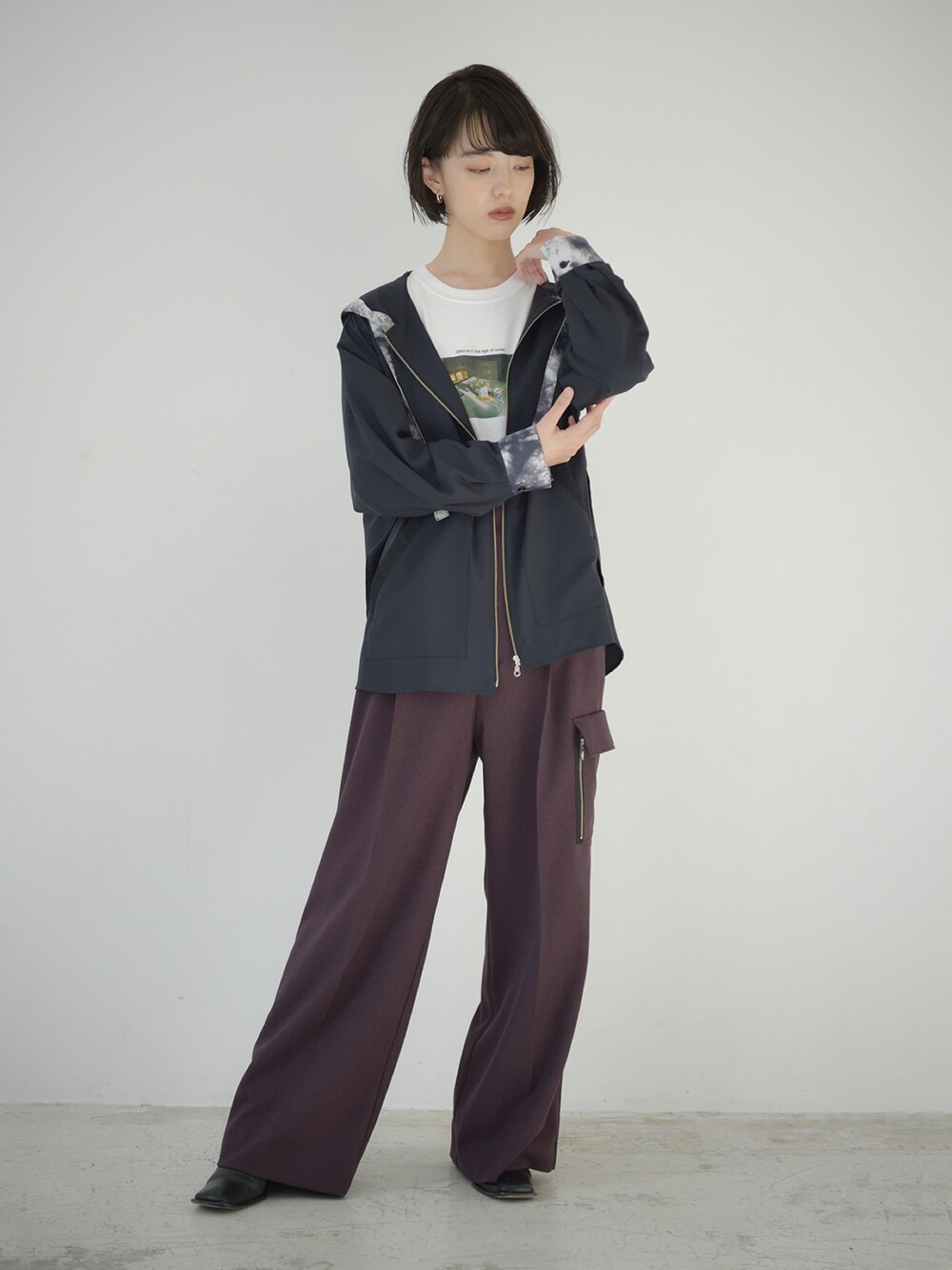 フード周り、袖口のタイダイ柄プリント生地の切り替えが印象的なZIPパーカ✨ パープルのセンタープレスカーゴPTとコーディネート✨ instagram ▶︎ melton_sric
