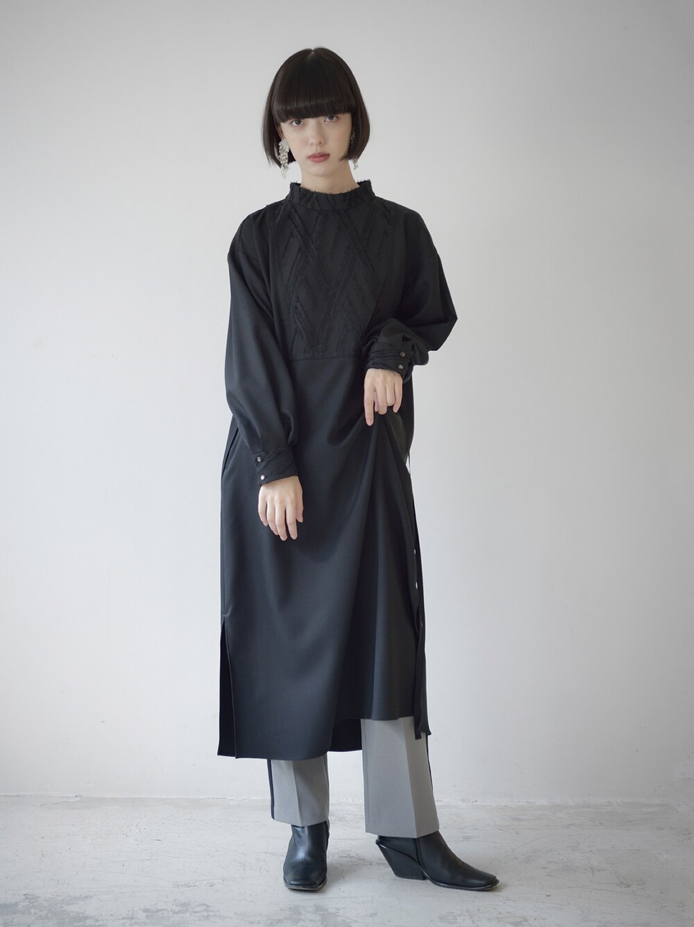 衿、胸元、カフスのジャガード生地が印象的なハイネックワンピース✨ グレーのセンタープレスパンツとレイヤードスタイル✨ instagram ▶︎ melton_sric