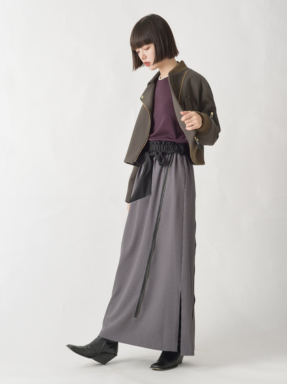 ガンクラブチェック柄とアシンメトリーなファスナーが目を引くロングフレアスカート✨ ショート丈のミリタリーブルゾンをコーディネート✨ instagram ▶︎ melton_sric