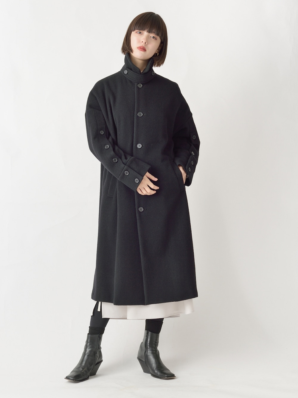 高めのスタンドカラーにスロートタブ仕様、両袖のボタンデザインとディテールデザインが新鮮なデザインコート✨ instagram ▶︎ melton_sric