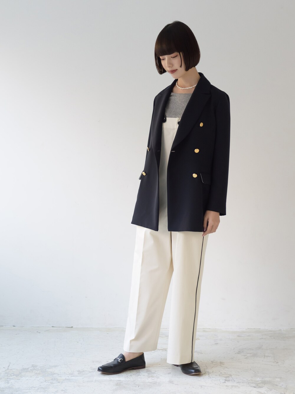 オフホワイトのサスペンダーPTに旬な紺ブレをコーディネート✨ instagram ▶︎ melton_sric