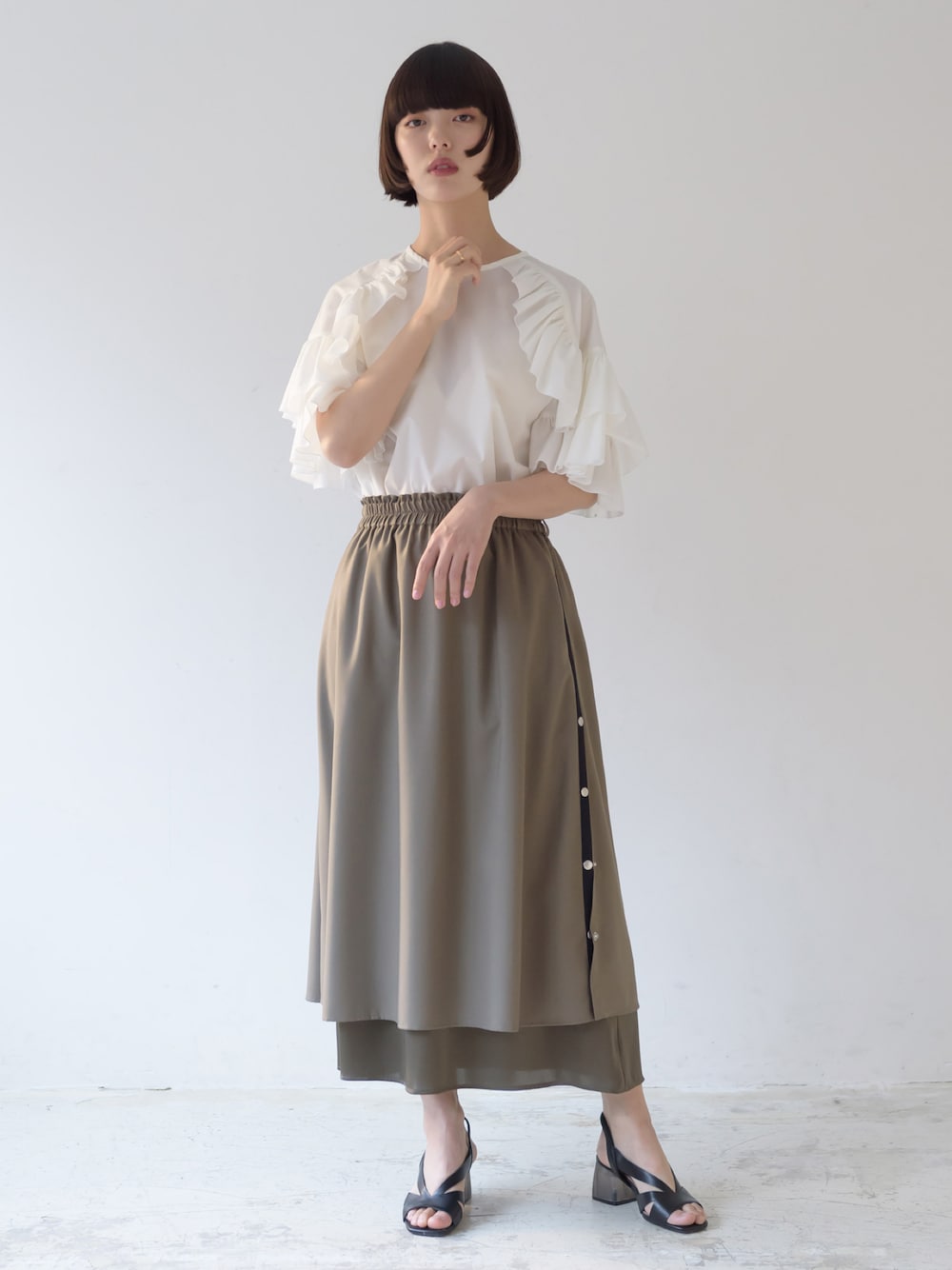 分量感ある袖フリルブラウス✨ サイドボタンのレイヤードスカートとコーディネート✨ instagram ▶︎ melton_sric