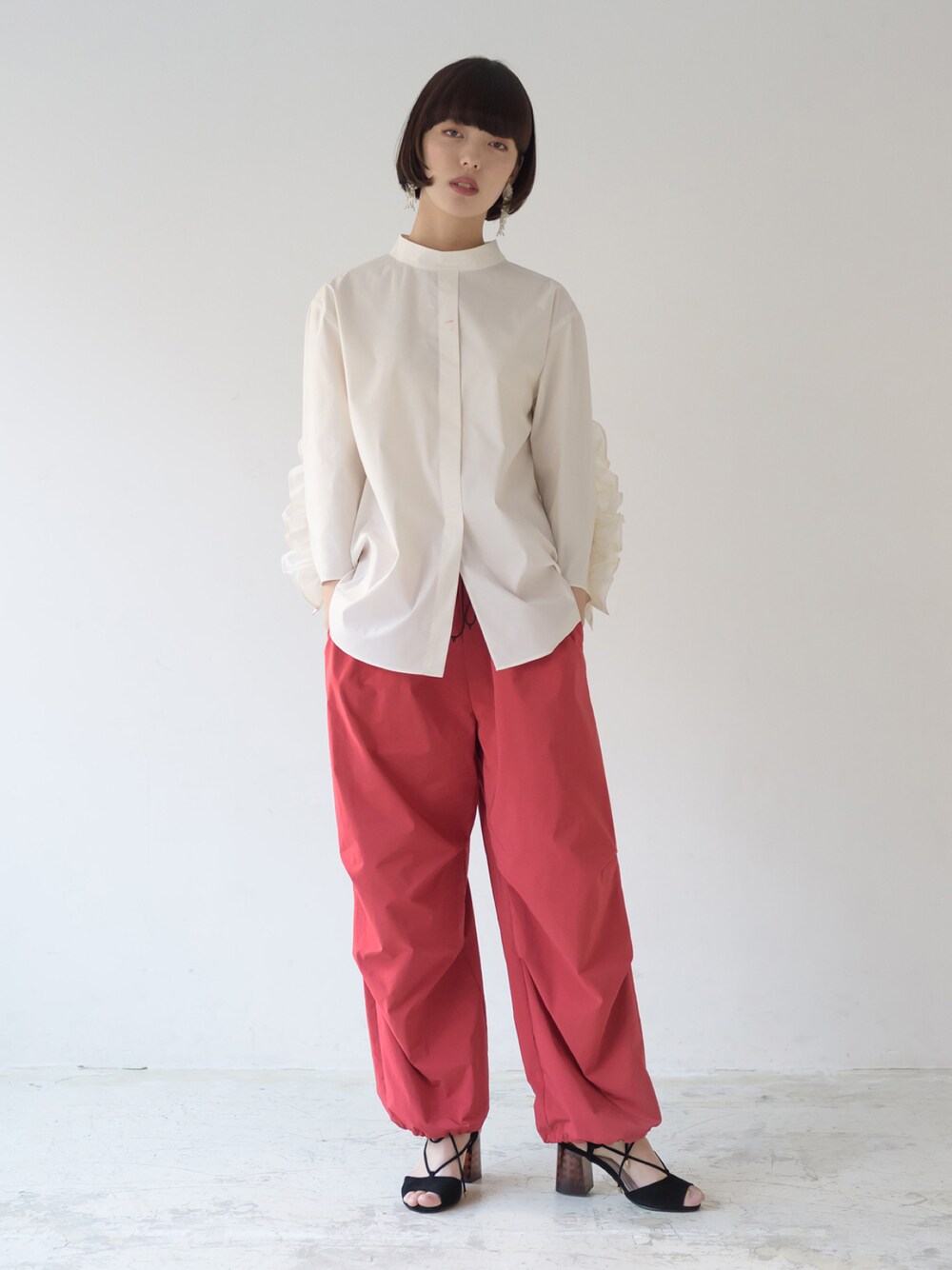 袖バックフリルブラウスにスカーレットカラーの裾絞りPTをコーディネート✨ instagram ▶︎ melton_sric