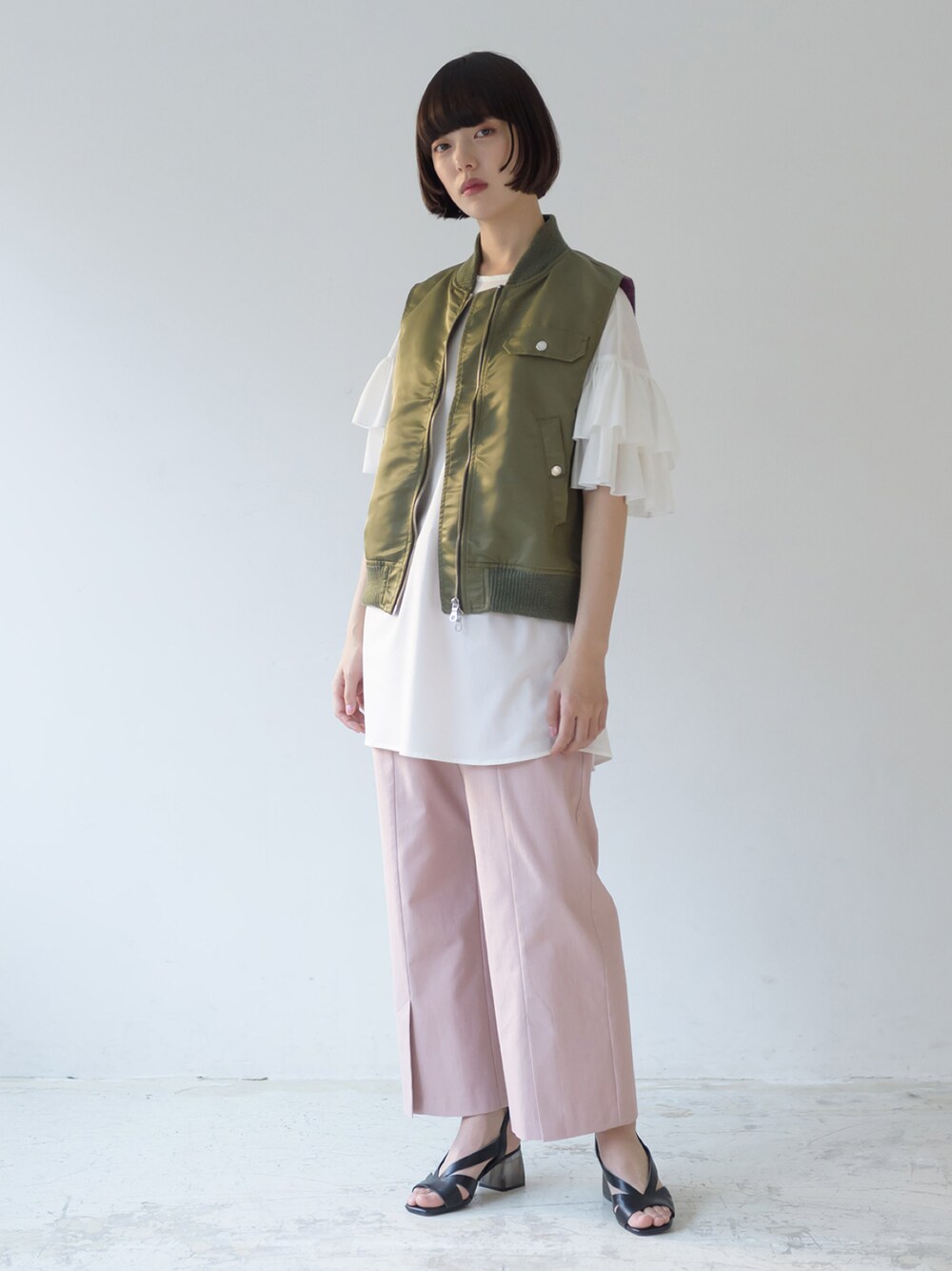大胆な袖フリルが印象的なブラウスにMA-1ベストを羽織って甘辛コーディネート✨ instagram ▶︎ melton_sric