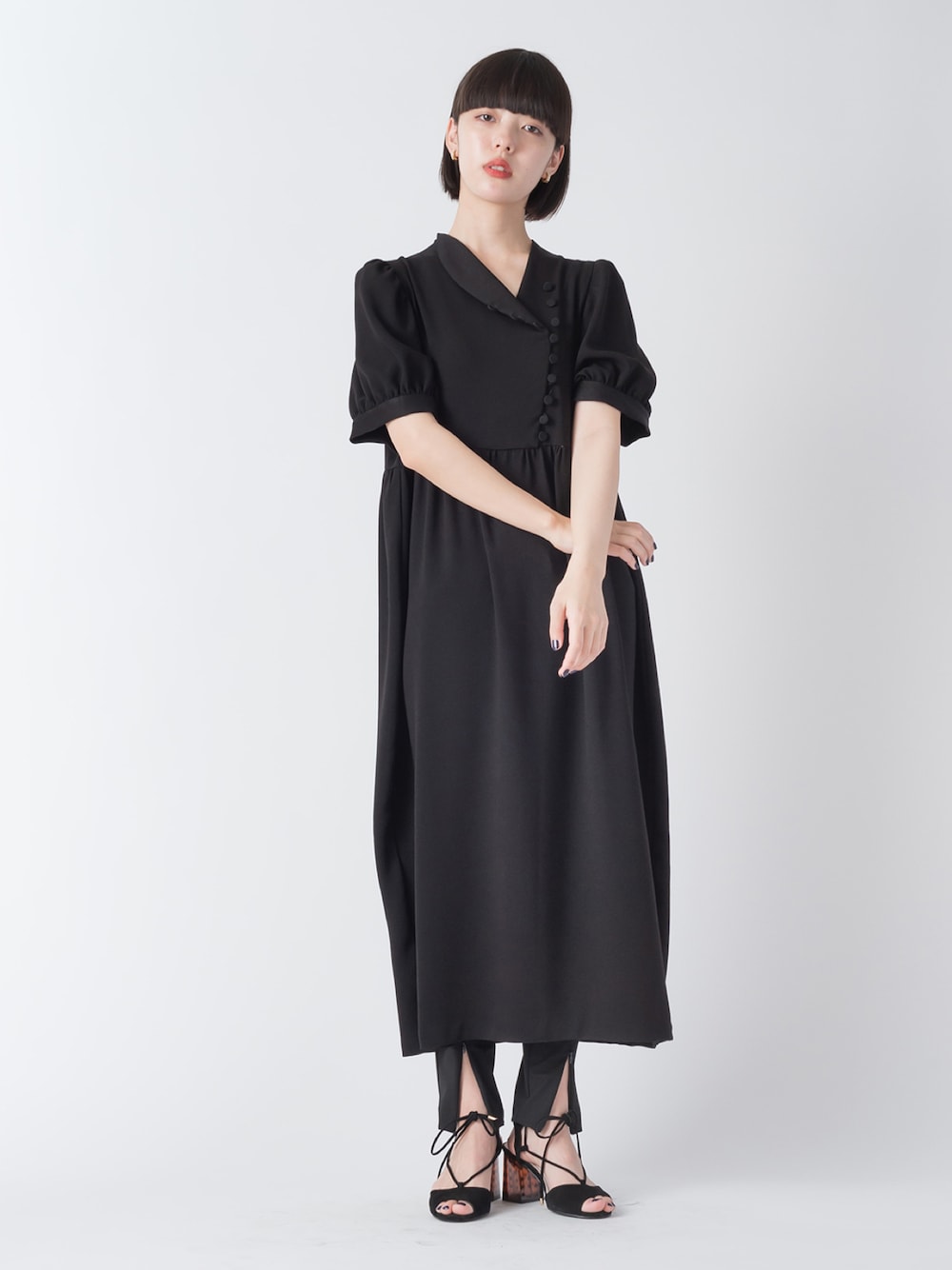パフスリーブと前合わせくるみボタンが可愛いアシンメトリーカラーワンピース✨ スキニーパンツとレイヤードスタイル✨ instagram ▶︎ melton_sric