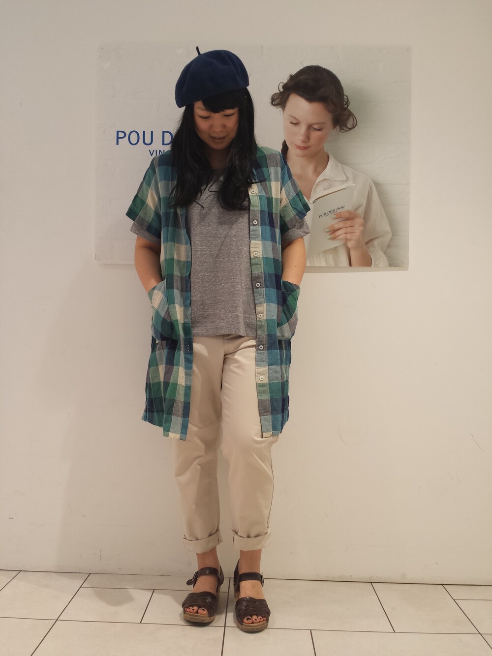 人気のブロックチェックワンピースを羽織りで着てみました。 配色が涼しげです。