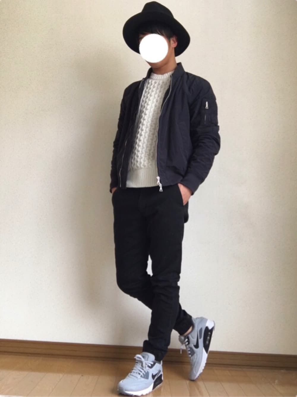 MA1コーデです。ニットと相性抜群! ハットも合わせてみました。 靴はNikeのエアマックス!安定の履きやすさです。