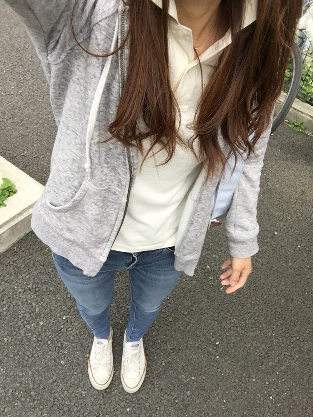 楽チン送迎コーデ。段々と暖かくなってきたので、爽やかさを出すために白のポロシャツにデニムスタイル。昨日はバギーでダボってたので、今日はぴったりスキニー🙌