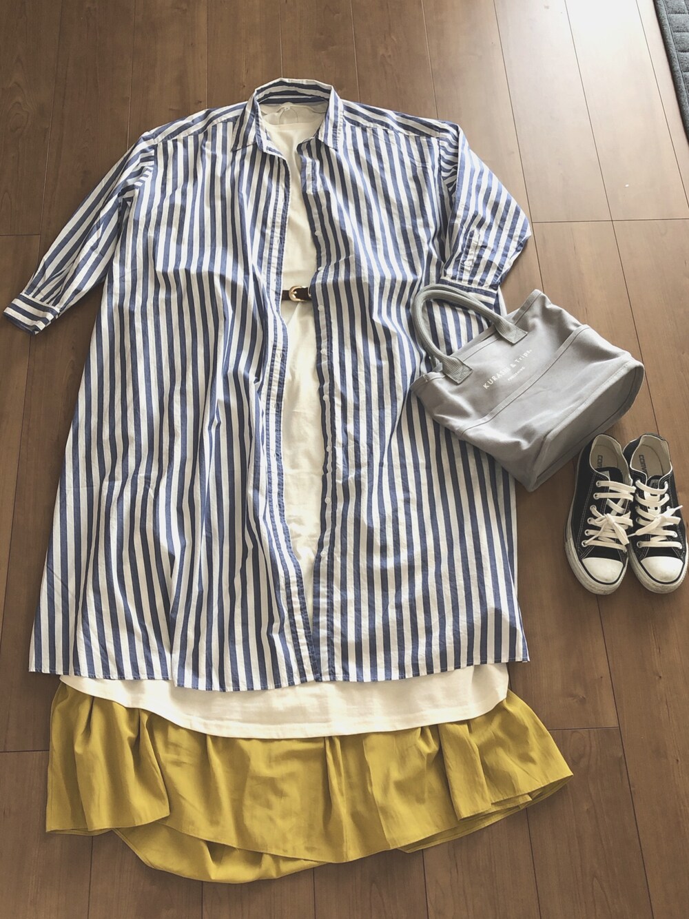 ストライプシャツにホワイトのワンピースとイエローのスカートを合わせた春コーデ☆ 記録用に(^^)