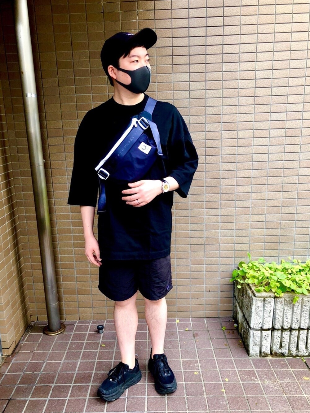 ブラック×ネイビー ブラックコーデ。 久々の買い物行けて満足。 足元はHOKAONEONE BONDAI6