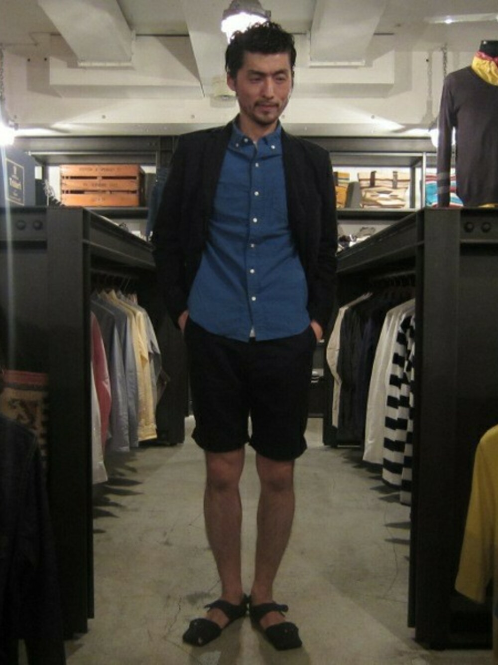 本日は気温も落ち着いてきたので、セットアップで。 ショーツにサンダルで軽さを演出。 ブルーも効いています。