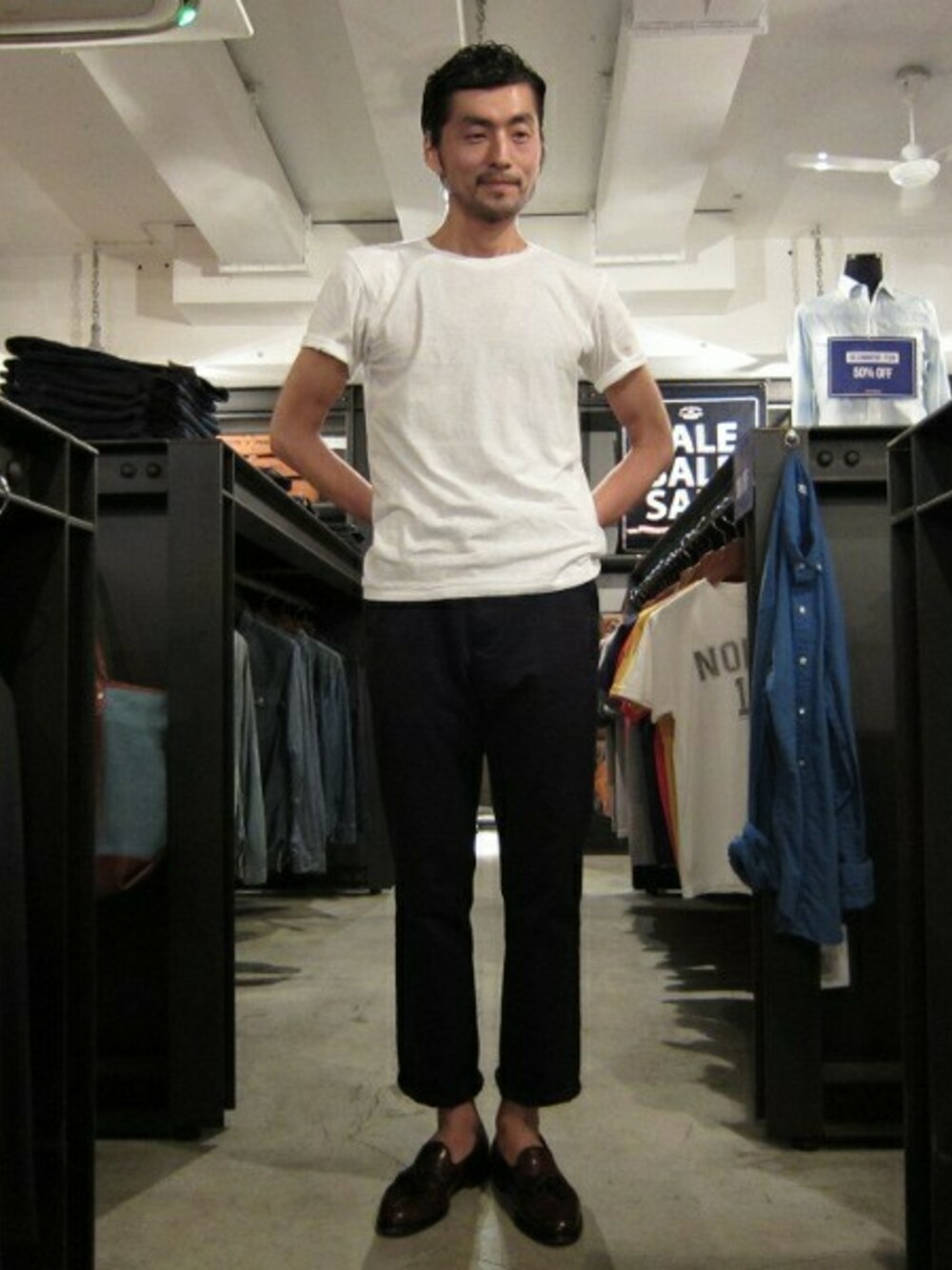 今日はチノパンとシンプルに。 デニムとは違った表情があるので紺にも色々ございます。 少しかしこまっております。