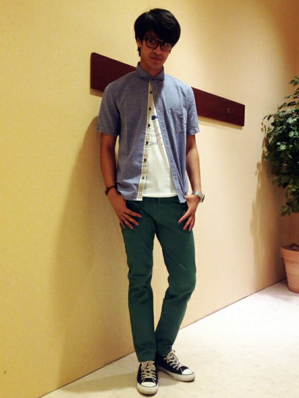 涼しげなダンガリー素材のシャツを羽織ったカジュアルスタイル。 ミントカラーのボトムがアクセントになります。