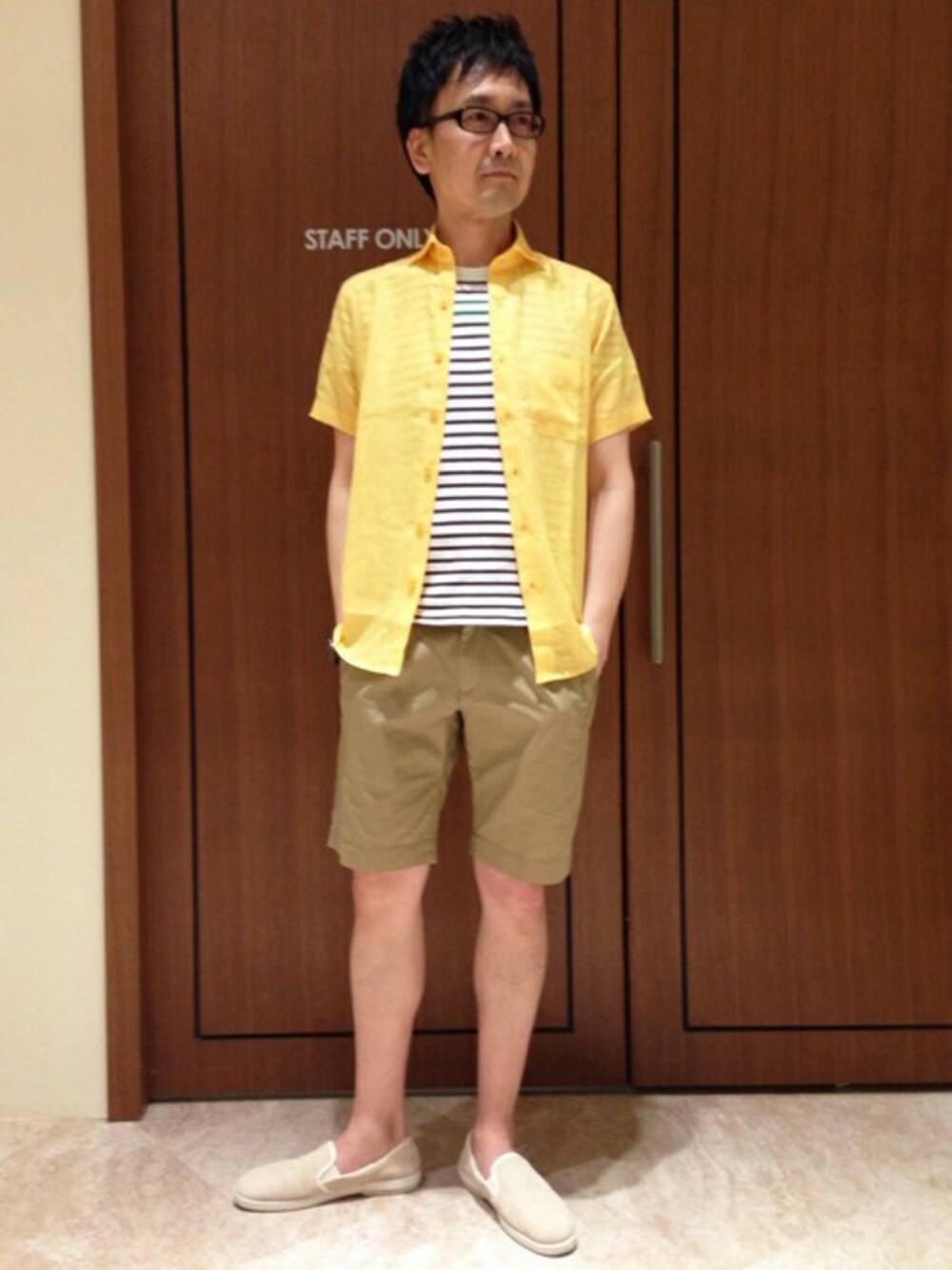 イエロー×ベージュのカラー合わせが柔らかい印象のスタイル。 ホワイトのインナーとシューズでバランスを取り、ボーダー柄がアクセントに。 リネンのシャツをさらりと羽織った、休日コーディネートです。