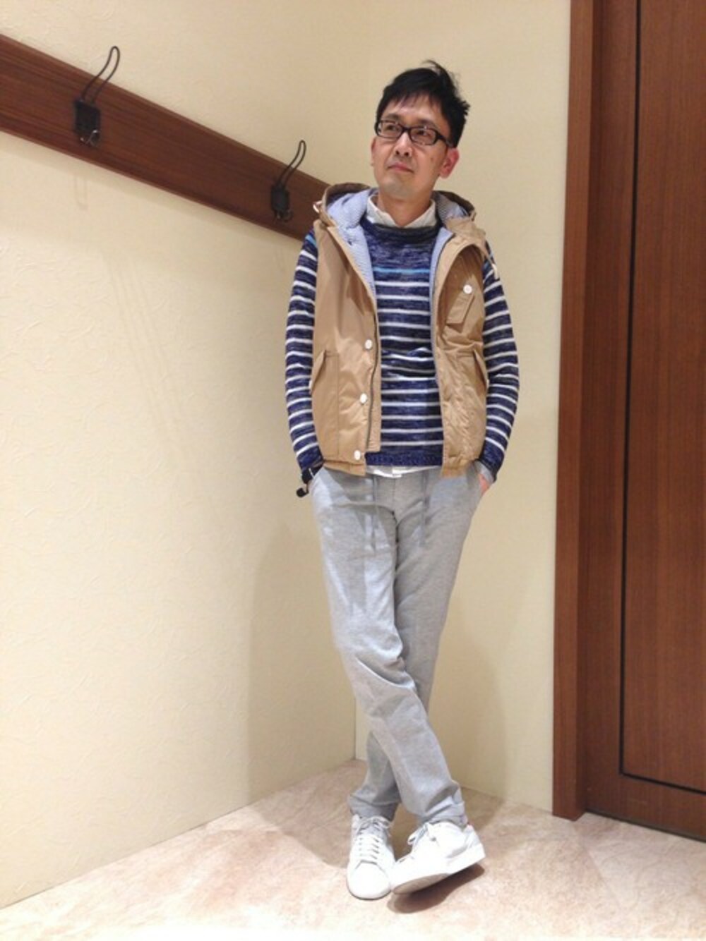 麻混素材のニットソーアンサンブルを軸に、中綿ベストをレイヤードしました。 暖かくなり始めたこの季節にぴったりのコーディネートです。 ボーダー柄を効果的に使い、マリンスタイルを表現しました。 ジャージ素材のボトムでリラックス感を出した大人の休日スタイル。