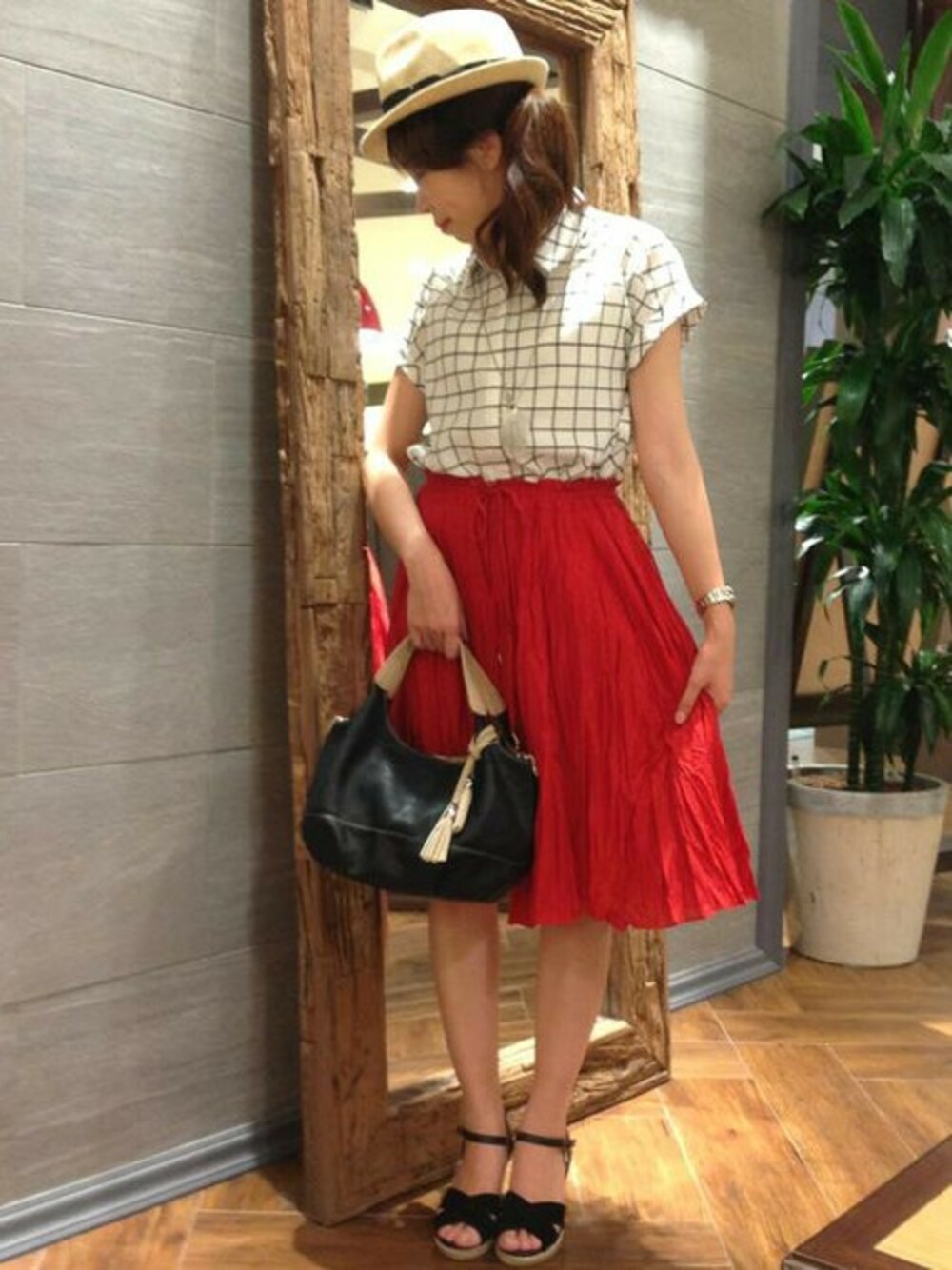 ウィンドペンチェックのブラウスは、1番上以外のボタンが隠しボタンになっています。 そして袖口は折り返しになっていて、スタイルアップ効果が高いアイテム♪ スカートにはインでスッキリ見せたいブラウスですが、パンツスタイルでは裾を出した着こなしもおススメ。 合わせるボトムを選ばない、優秀ブラウスです。